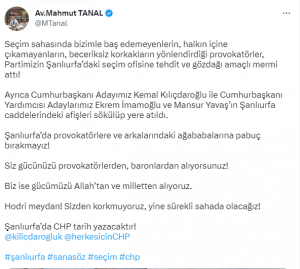 İBB Başkanı Ekrem İmamoğlu’a yönelik Erzurum’da yapılan taşlı saldırının etkisi sürerken CHP milletvekili Mahmut Tanal, partisinin Şanlıurfa seçim ofisine de saldırı gerçekleştirildiğini açıkladı. Tanal, “Seçim sahasında bizimle baş edemeyenlerin, halkın içine çıkamayanların, beceriksiz korkakların yönlendirdiği provokatörler, Partimizin Şanlıurfa’daki seçim ofisine tehdit ve gözdağı amaçlı mermi attı” dedi.Erzurum’da cumhurbaşkanı yardımcısı adayı ve İBB Başkanı Ekrem İmamoğlu’na yapılan taşlı saldırının ardından Şanlıurfa’da CHP’nin seçim ofisine de bir saldırı gerçekleştirildi.”GÖZDAĞI AMAÇLI MERMİ ATTILAR”Olayı duyuran CHP milletvekili Mahmut Tanal, paylaşımında şunları söyledi: “Seçim sahasında bizimle baş edemeyenlerin, halkın içine çıkamayanların, beceriksiz korkakların yönlendirdiği provokatörler, Partimizin Şanlıurfa’daki seçim ofisine tehdit ve gözdağı amaçlı mermi attı.